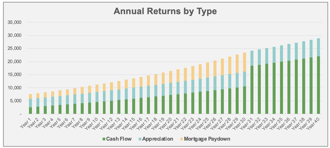 Cash flow increases over time. This is mostly because rent and expenses are expected to rise with inflation, but one major expense (my mortgage) is fixed.