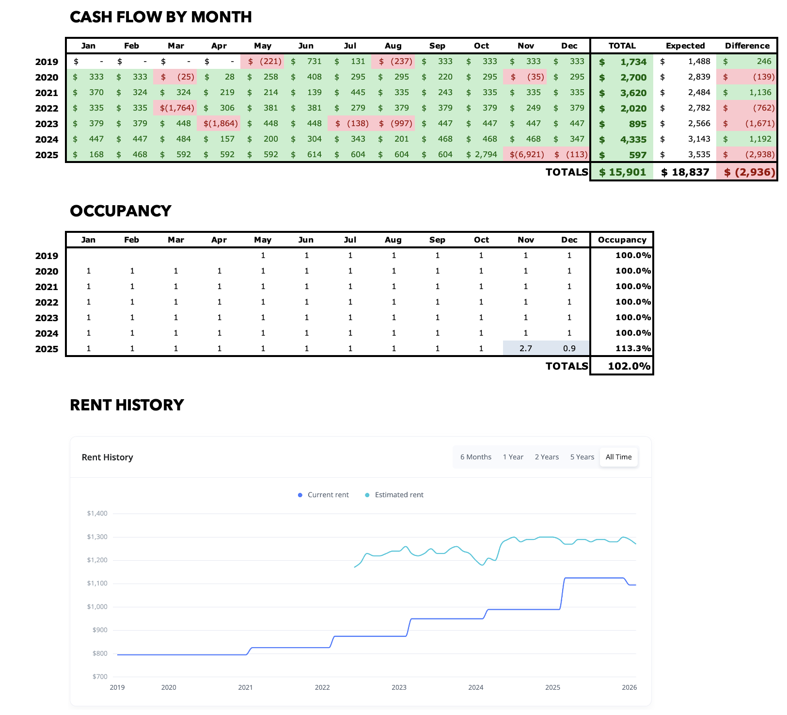 The tenant renewed once again, with a new rent of $990/mo. While this is still quite a bit below market rent, I’m happy to continue with incremental increases for this long-term tenant.