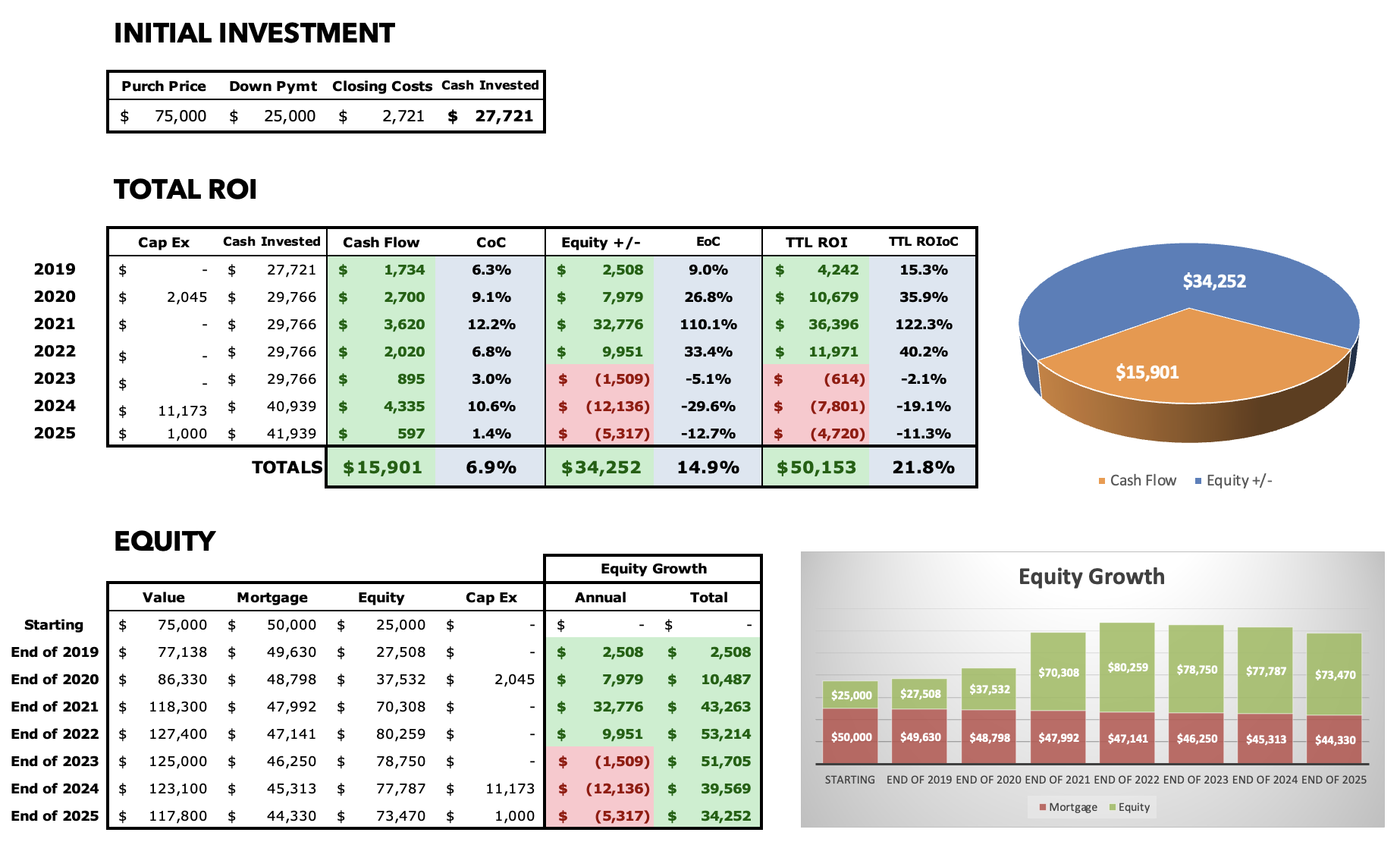 I financed 67% of this purchase with a conventional loan at 4.93%, so my down payment was $25,000, and I incurred $2,721 in closing costs. I used the RIA Property Analyzer to run the final numbers on this property – here are the key metrics that the analyzer calculated for me: