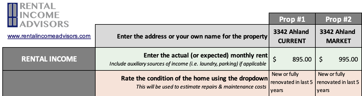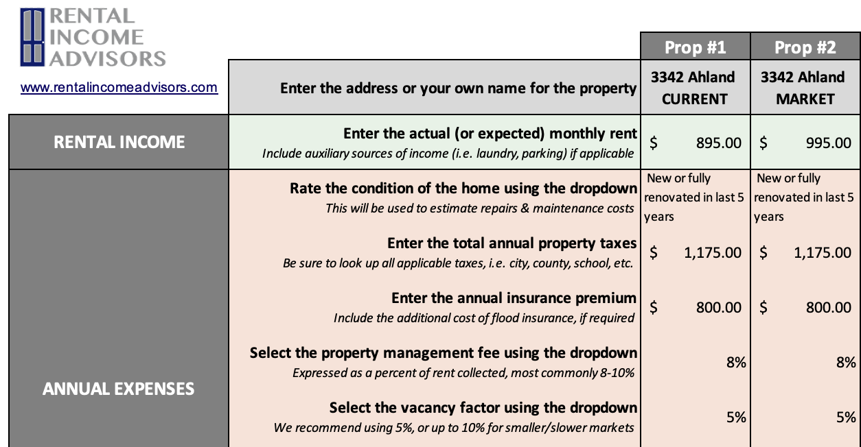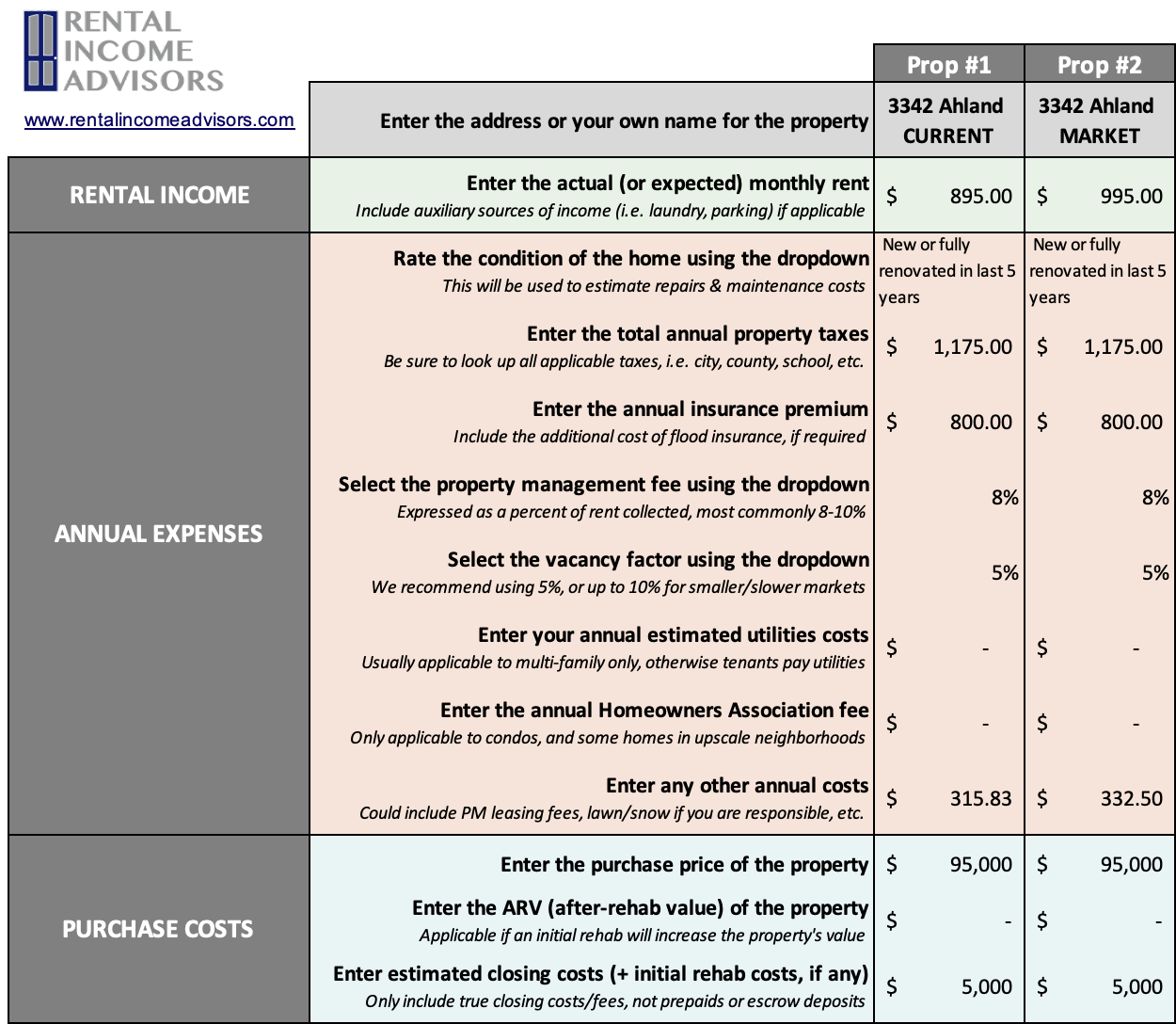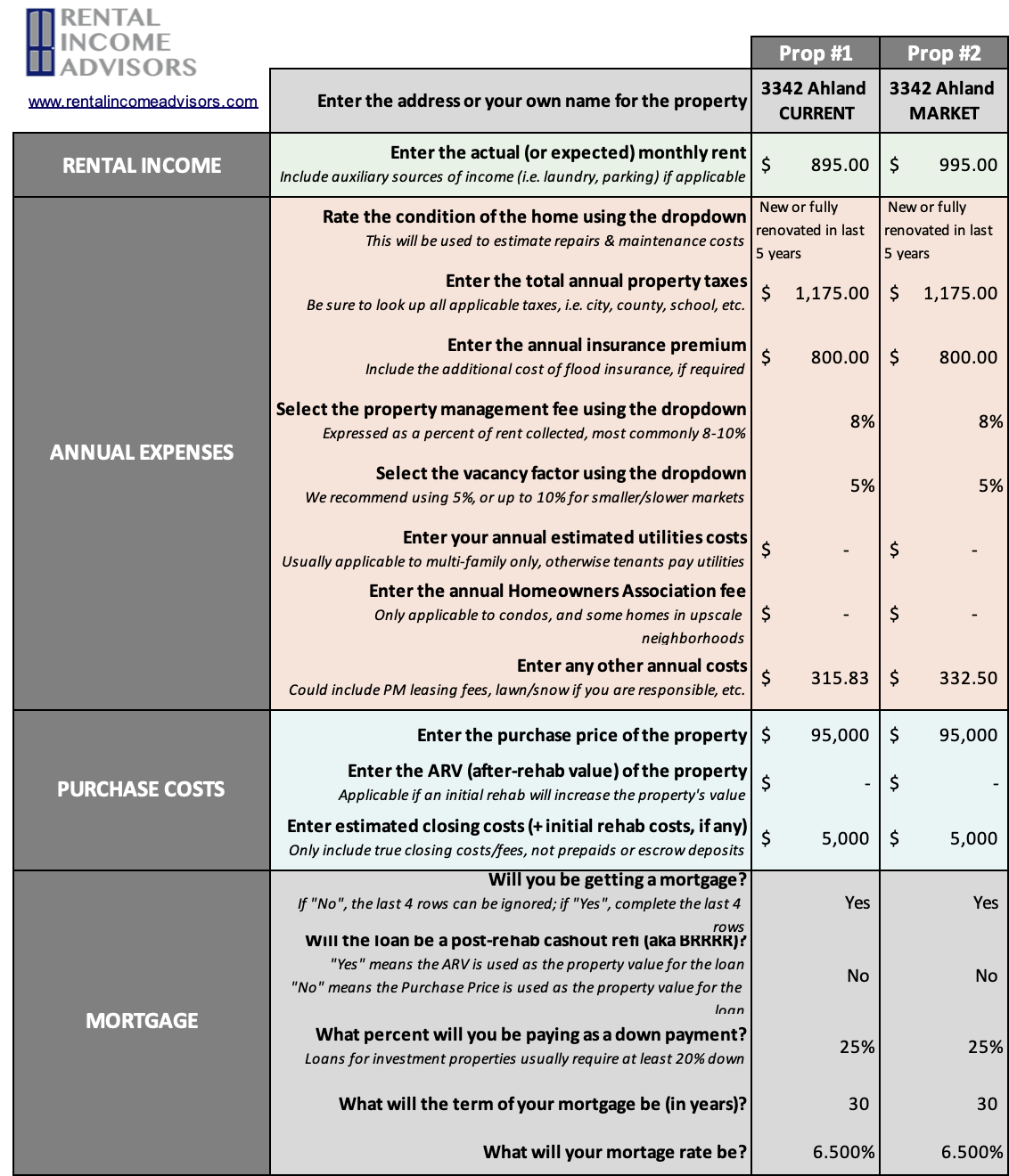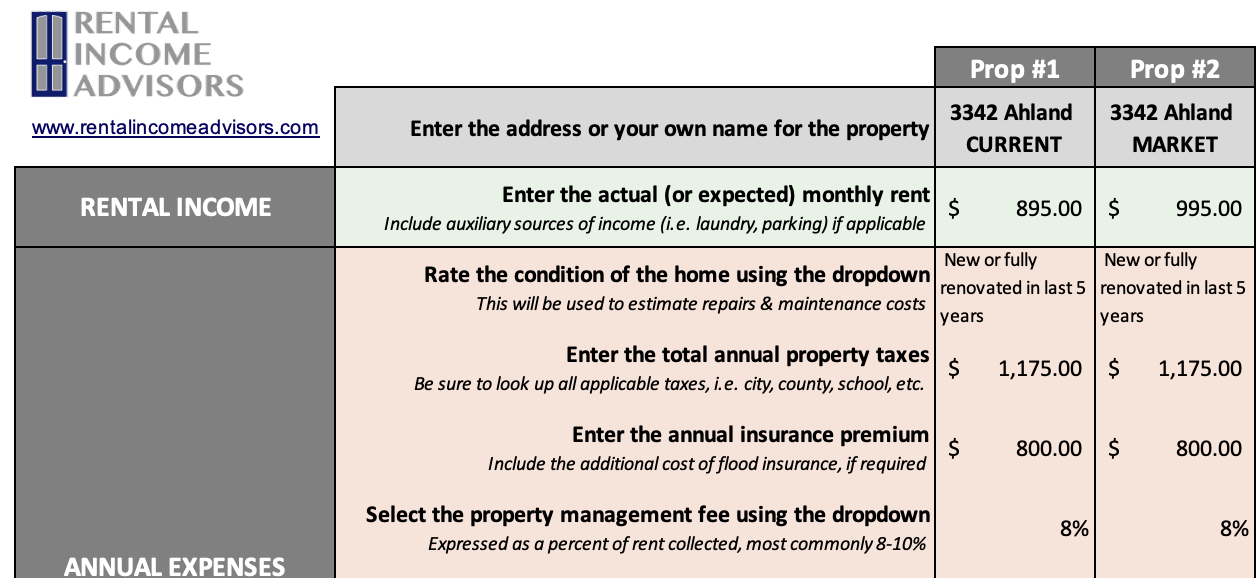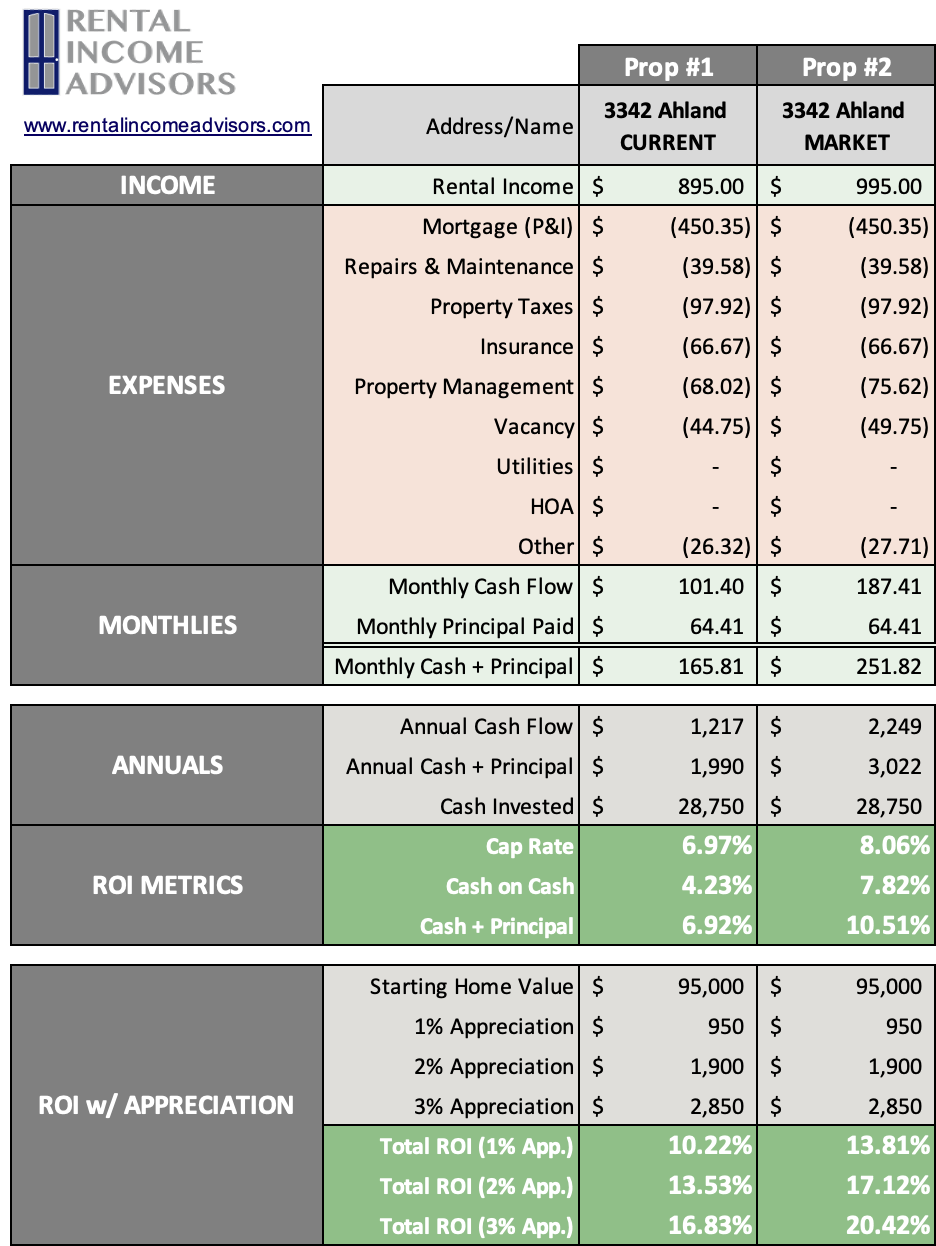 When we left off, I had set up the RIA Property Analyzer with two columns, one to analyze the property assuming the current rent of $895, and another to run the numbers with the higher market rent of $995 – here’s what it looked like: