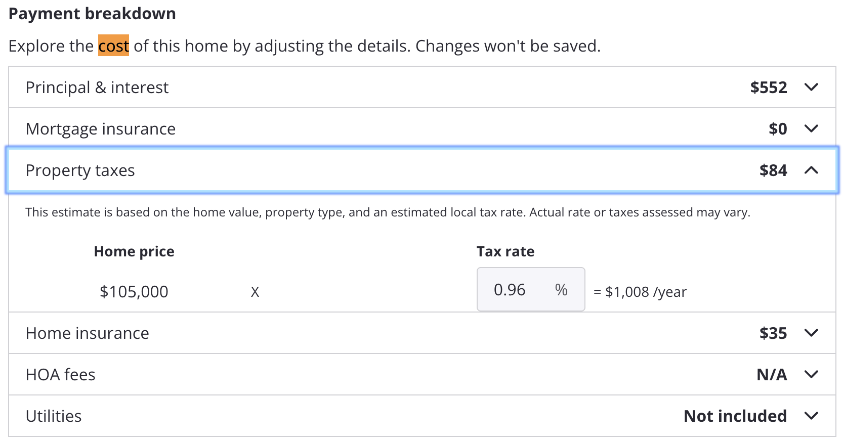 There are a few “quick” ways to estimate your property taxes. For example, there is a property tax history included in the Zillow listing, which is based on public data they’re able to pull in. Zillow also calculates taxes in the “Payment breakdown” section by multiplying the purchase price by the average local tax rates. (There are other online calculators that use the same method of “prevailing local tax rates” to estimate property taxes.)