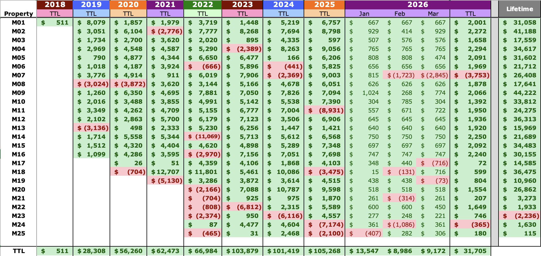 NOTE: The reduction in expected monthly cash flow in 2026 reflects significant increases in both insurance costs and property taxes I experienced in 2025. I expect insurance increases to be more muted going forward, and property tax adjustments are only made in Memphis every four years, so I’m good there for a while.